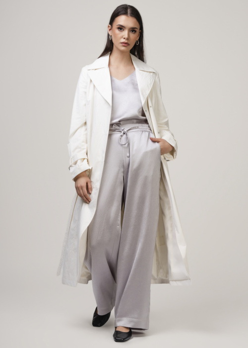 Ivo Nikkolo sieviešu pavasara-rudens mētelis Mertel ir elegants un sievišķīgs tērps, kas lieliski pieguļ augumam. Mētelim ir atlokāma apkakle un garš piegriezums, kas piešķir tam izsmalcinātu izskatu. Priekšpusē ir aizdare, kas nodrošina vieglu aiztaisīšanu, un piedurkņu galos ir sprādzes, kas piešķir papildu stilu. Viduklī ir sasienama josta, kas akcentē siluetu, un aizmugurē ir šķēlums, kas nodrošina kustību brīvību.