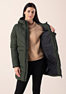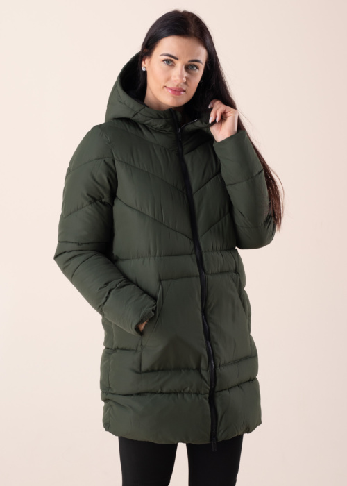 Noisy May Dalcon jaka ar pagarinātu un vienkāršu dizainu ir ideāli piemērota ar brīvā laika apģērbu. Priekšpuse aizveras ar divvirzienu rāvējslēdzēju un augšējā apkakle ir savienota ar fiksētu kapuci, kas nodrošina aizsardzību no vēsiem vējiem. Jakas sānos ir atvērtas kabatas un iekšpuse ir pārklāta ar gludu poliestera audumu. Tā ir daļa no BeGreen kolekcijas, kas tiek ražota, izmantojot videi draudzīgākus materiālus, akcentējot Noisy May apņemšanos radīt ilgi kalpojošus apģērbus. Modelis ir 176 cm garš un valkā S izmēru. Garums no aizmugures līdz apakšai norādīts 84 cm. Materiāls - virsma: poliesters 100%; iekšpuse un izolācija: 100% pārstrādāts poliesters. Krāsa: zaļa.