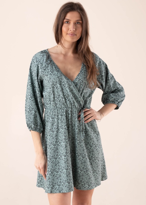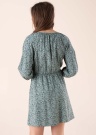 Jauka JDY kleita der valkāšanai vasarā. Ar brīvāka piegriezuma viegla kleita ir ar interesantu rakstu un ar V-veida kakla izgriezumu. Viduklī ir gumija , priekšpusē ir sasiešanas lentes , kā arī piedurkņu galos ir gumijas. Audums ar patīkamu pieskārienu ļauj izbaudīt valkāšanu. Foto: augums 178 cm valkā S izmēru.