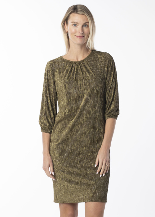 Kairi Vilderson sieviešu kleita ir lieliska izvēle svinīgiem pasākumiem, pateicoties tās taisnajam siluetam un apaļajam kakla izgriezumam. Kleitai ir trīs ceturtdaļu garas piedurknes, un tā ir izgatavota no elastīga auduma, kas brīvi krīt un piešķir mirdzošu efektu. Priekšpusē esošais krokojums un reljefa raksts piešķir tai īpašu šarmu. Modele ir 177 cm gara un nēsā 38. izmēru.