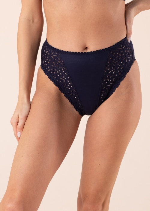 Lauma apakšbikses Classic ir radītas ikdienas ērtībām! Apakšbiksēm ir augsta jostasvieta, un tās izgatavotas no elastīga auduma, kas pieguļ ķermenim. Sānos efektīgas mežģīņu detaļas. Modeles augums 176 cm, valkā 38. izmēru. Materiāls: poliamīds 69%, kokvilna 18%, elastāns 13%. Krāsa: tumši zila.