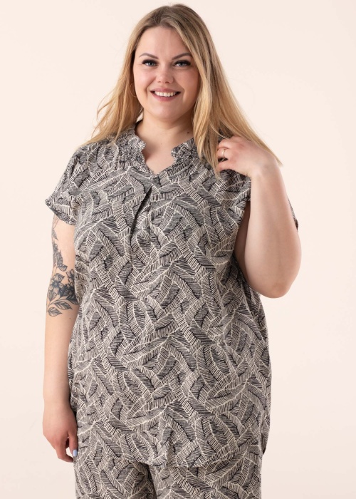 Блузка Ciso с уникальным рисунком - идеальный выбор для ношения с джинсами или толстовками! V-образный вырез блузки дополнен эластичным воротником. Мягкая и легкая ткань чрезвычайно комфортна на теле, а практичная длина позволяет носить одежду с различными стилями. Сочетается с брюками. Рост модели - 167 см, носит размер 46.