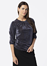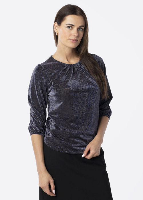 Блузка от Kairi Vilderson — это праздничная и эффектная вещь с круглым вырезом и рукавами длиной три четверти. Она украшена блестящими элементами и сборками на вырезе, а также имеет резинку на манжетах. Полупрозрачная ткань добавляет образу изысканности и легкости. Модель имеет рост 176 см и носит размер 38.
