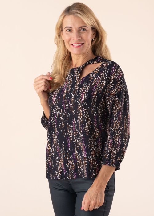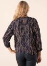 Блузка от Esprit тонкая и легкая, она подходит для самых разнообразных дней. Свободная блузка с рукавами три четверти хорошо сидит и движется вместе с вами. Воротник имеет эффектную деталь, на затылке находится застежка на пуговицы, на концах рукавов имеет резинка. Настроение создается благодаря шикарному декорму поверхности. Рост модели 178 см, изделие в размере S.
