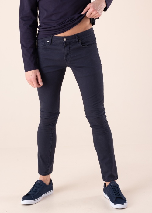 Skinny Fit покроя брюки Guess Miami имеют пояс Low Rise и штанины Skinny Leg покроя. Лёгкая хлопчатобумажная ткань удобная при ношении и хорошо прилегает к телу. Модель с пятью карманами имеет спереди застёжку на пуговицу и молнию. Рост модели 193 см, носит размер 32-34. Материал: хлопок 97%, эластан 3%. Цвет: тёмно-синий.