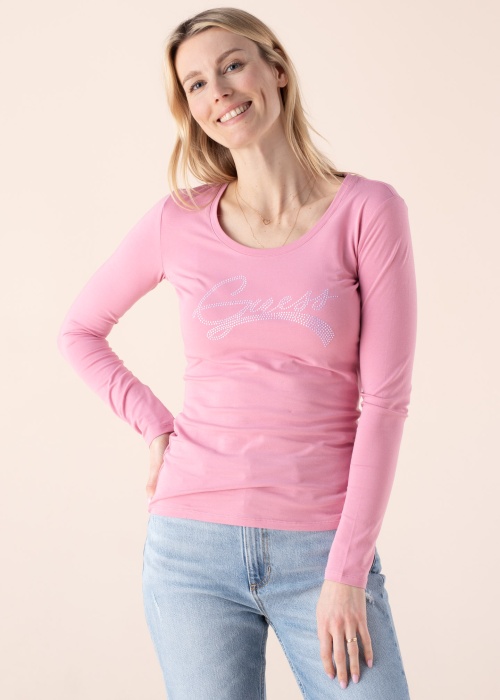 Повседневная футболка Guess позволяет везде чувствовать себя хорошо. Длинные рукава футболка- обтягивающий покрой, эластичная и удобная , также внимание привлекают блестящие стразы на груди. Рост модели - 177 см и носит размер S.