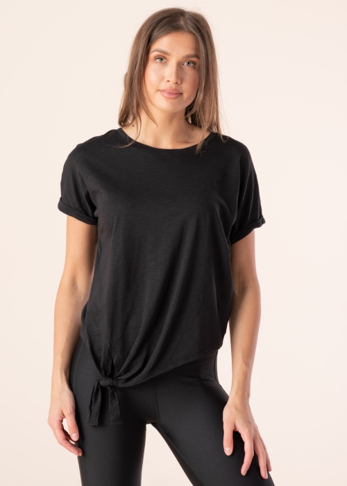 Простая футболка Only Play придаёт движению удобсва. Удобная и с круглой горловиной футболка- просторный дизайн и эластичная. Выразительности добавляет завязываемый шнурок снизу. Рост модели - 178 см и носит размер S.