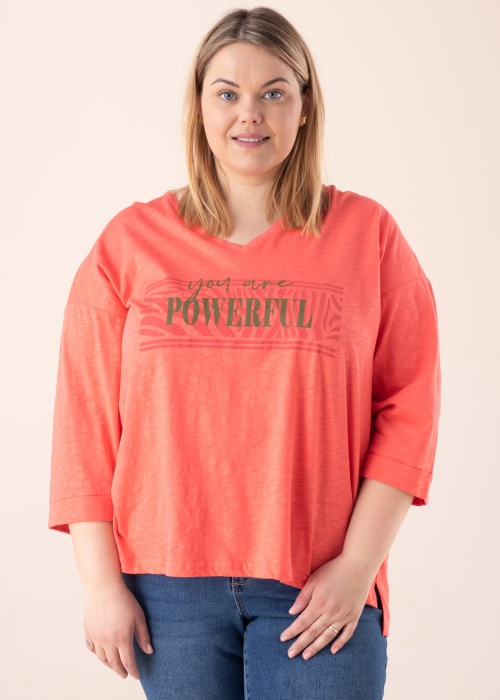 Красивая футболка Fransa Plus Size подходит для повседневного ношения. V-горловина футболка- рукава 3/4, из мягкого хлопка и с удлинённым покроем сзади. Выразительности добавляет надпись на груди , на внешнем боку разрез , также удобства добавляет эластичность материала. Рост модели - 167 см и носит размер 46-48.