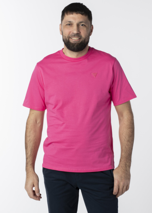 Стильная мужская футболка Guess с круглым вырезом, которая привлекает внимание своим дизайном. Она имеет короткие рукава и обеспечивает свободу движений благодаря своей эластичности и мягкости. Логотип бренда Guess расположен на груди. Модель имеет рост 188 см и носит размер L.