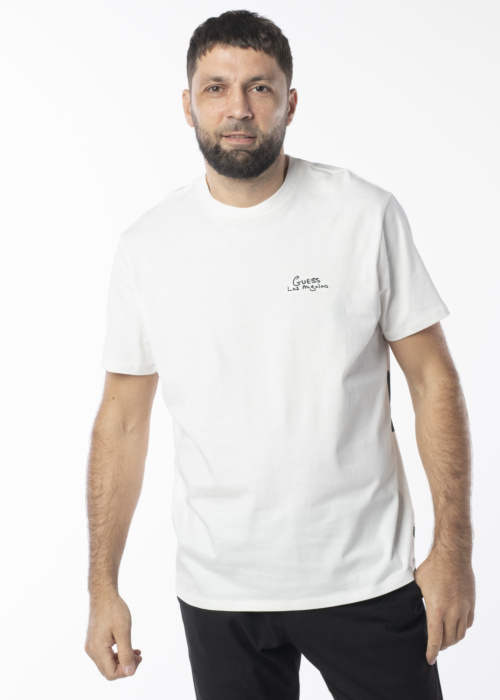 Футболка Guess для мужчин отличается уникальным и стильным дизайном. Она имеет круглый вырез и изготовлена из мягкой ткани, обеспечивающей комфорт. Эффектный принт на спине и фирменная надпись на груди придают изделию особый шарм. Модель имеет рост 188 см и носит размер L.
