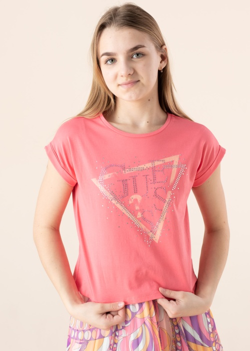 Скромная футболка Guess подходит идеально для повседневного ношения. Модная "Сap" рукава футболка - девичья эластичная и с приятным прикосновением. на передней стороне- иконичный мотив бренда , также выразительности добавляют блестящие стразы. Рост модели - 147 см и носит размер 147.