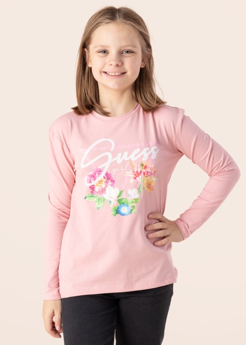 Эта стильная футболка Guess для девочек имеет прямой крой и длинные рукава. Она немного длиннее сзади, что придает ей особый шарм. Материал приятный на ощупь и эластичный, обеспечивая комфорт при носке. На передней стороне футболки находится яркий рисунок, а воротник выполнен в рубчик. Модель ростом 150 см носит размер 147.