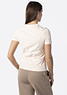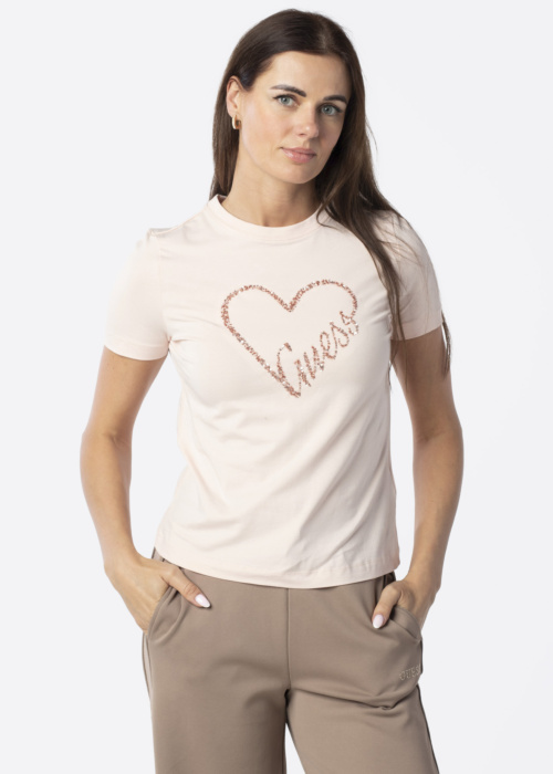 Футболка Guess для женщин отличается простым, облегающим кроем и круглым вырезом. На передней части футболки расположен интересный узор, украшенный блестящими пайетками. Эта модель идеально подходит для создания стильного и современного образа. Рост модели составляет 176 см, и она носит размер S.