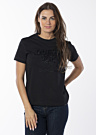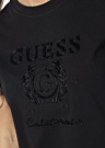 Женская футболка от Guess имеет круглый вырез и прямой крой. Она выглядит эффектно и приятна на ощупь, с логотипом бренда на груди и сверкающими камнями спереди. Модель на фото имеет рост 176 см и носит размер S.