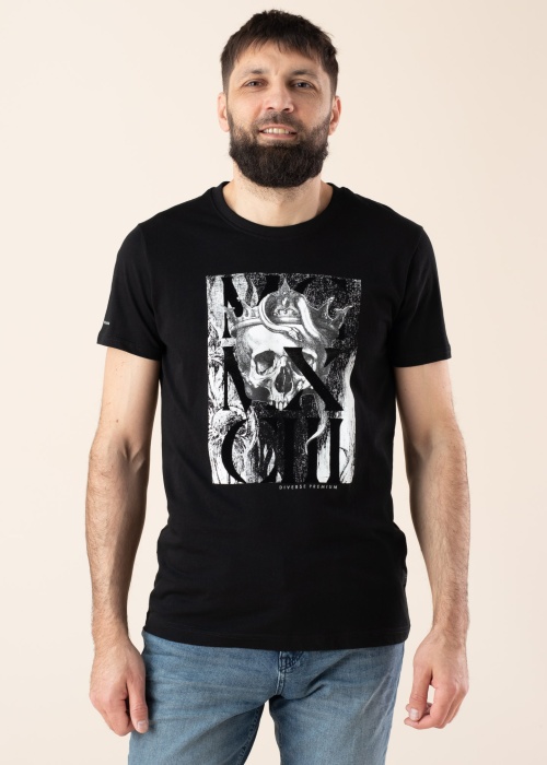 Своеобразная футболка Diverse сделает каждый день особенным. Рокерская покрой Slim Fit футболка- с круглой горловиной, хорошо сидящая и с приятным прикосновением. Удобства добавляет эластичность материала , также выразительности добавляет эффектный принт на передней стороне. Рост модели - 188 см и носит размер L.
