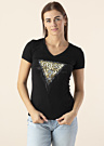 Женская футболка от Guess с V-образным вырезом и короткими рукавами выполнена в простом и стильном дизайне. На передней части футболки изображён эффектный принт с тигром, который придаёт модели уникальность. Рост модели составляет 176 см, и она носит размер S.