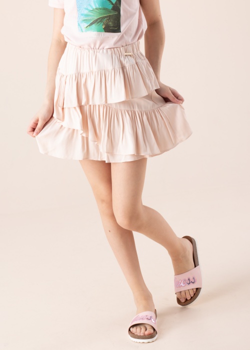 По-настоящему красивая с воланами юбка Guess создаёт привлекательный и модный облик! В пастельных тонах изделие имеет эластичный пояс на резинке, красиво обхватывающий талию. Ткань из вискозы изумительно мягкая и приятная. Рост модели 147 см, носит размер 136. Общая длина изделия 37,5 см. Материал: вискоза 100%. Цвет: светло-розовый.