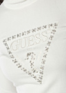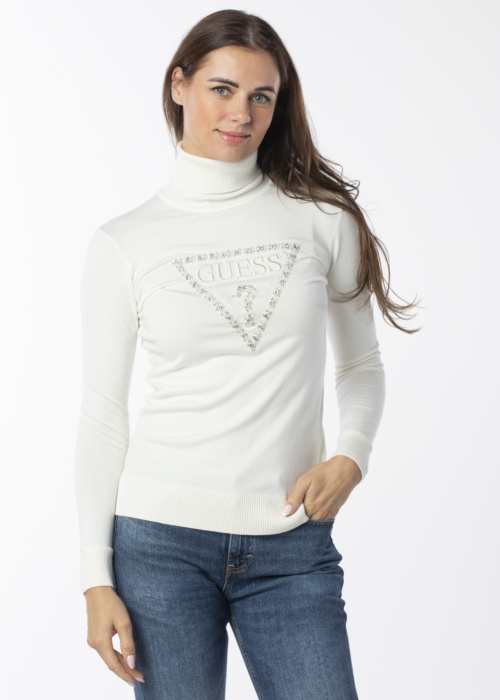 Женский свитер от Guess с высоким воротником выглядит эффектно и стильно. Он выполнен из мягкого и теплого материала, что делает его идеальным для холодной погоды. На груди свитера расположен фирменный узор бренда, а спереди он украшен сверкающими камнями, добавляющими блеск и элегантность. Модель на фото имеет рост 176 см и носит размер S.