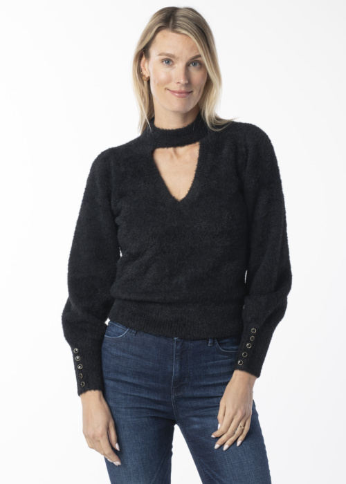 Женский свитер от Guess с V-образным вырезом отличается уникальным и стильным дизайном. Он имеет длинные рукава, эластичную и блестящую вязаную текстуру, а также манжеты с пуговицами и логотип бренда на спине. Модель имеет рост 177 см и носит размер S.