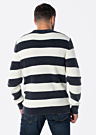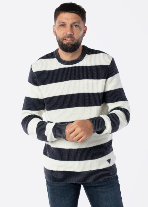 Свитер Guess Herbie для мужчин — это уютный свитер с полосатым узором. Он изготовлен из эластичного материала с ребристой текстурой и имеет ребристый воротник. Модель имеет рост 188 см и носит размер L.