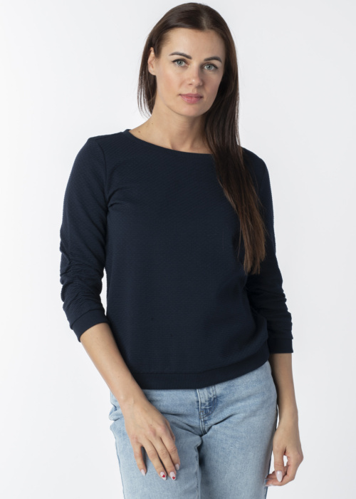 Женский свитшот от Tom Tailor отличается комфортом и стильным дизайном. Он имеет круглый вырез и рукава длиной три четверти, выполнен из мягкого и эластичного материала, что делает его идеальным для повседневного ношения, будь то дома, на работе или в свободное время. Рельефный узор на поверхности и сборка на рукавах придают изделию уникальность, а манжеты и нижний край оформлены в рубчик. Этот продукт является частью коллекции Be Part, созданной из экологически чистых материалов. Модель на фото имеет рост 176 см и носит размер S.