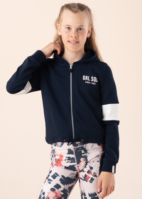 Толстовка короткого кроя на молнии в спортивном свободном стиле от бренда Tom Tailor. Полочки с застёжкой на удобной молнии «трактор». Декорированный надписью „GIRL POWER” уютный капюшон обеспечивает защиту от холода. Длинные рукава обрамляют эластичные манжеты. Низ изделия на утягивающем шнуре. Мягкая ткань с содержанием хлопка комфортна для кожи и обеспечивает хорошую посадку. Рост модели: 146 см. Демонстрируемое изделие: размер 152. Состав материала: хлопок 60%, полиэстер 40%. Цвет: тёмно-синий