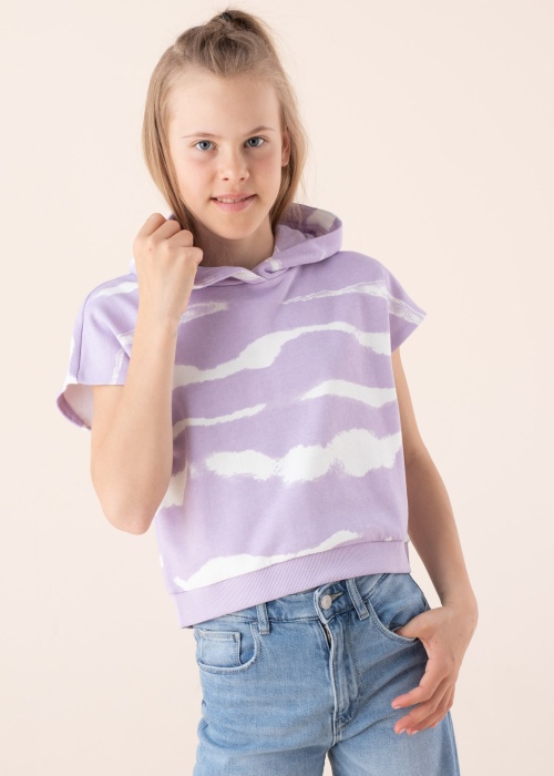 Кофта от Tom Tailor свободного кроя оверсайз выглядит очень модно! Укороченная модель имеет просторный капюшон, короткие рукава делают изделие более летним, дополненным яркой цветовой гаммой. Извилистая резинка по нижнему краю придает кофте хорошую посадку, а мягкая и эластичная ткань очень удобна в ношении. Знак устойчивого развития Be Part гарантирует, что при производстве одежды используются экологически чистые материалы. Рост модели 146 см, изделие в размере 152.