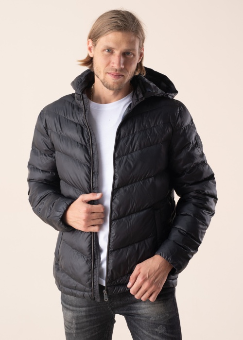 Лёгкая куртка от бренда Guess подходит и для ненастной погоды. Тонкая поверхность изделия с водоотталкивающими и ветрозащитными свойствами. Небольшой воротник-стойка. Полочки с застёжкой на молнию. Съёмный капюшон с фиксацией на молнии. На передней части диагонально расположенные нагрудные карманы с планкой и с застёжкой на молнию. Тонкая, гладкая подкладка. Пушистый, мягкий, с хорошими теплоизоляционными свойствами наполнитель Thermore Ecodown выполнен из переработанных волокон полиэстера. Рост модели 193 см. Демонстрируемое изделие размер L. Длина изделия по спинке, для данного размера, 73 см. Состав материала. Основная часть, подкладка и наполнитель: полиэстер 100%. Цвет: чёрный