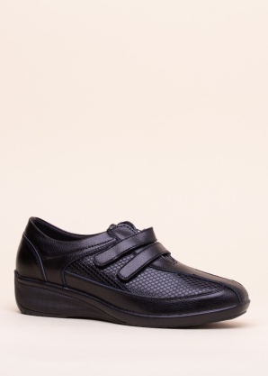 Эти простые туфли Topway сделаны из сочетания экокожи и кожи. Благодаря своему дизайну их легко носить как на повседневные, так и на более официальные мероприятия. Спереди туфли застегиваются на ноге с помощью двух тонких бархатных застежек, а верхняя часть акцентирована узорчатыми боковыми сторонами и вставкой. Внутренняя поверхность также покрыта сочетанием искусственной кожи что обеспечивает желаемый комфорт при ношении. Стелька с приятной мягкостью, обеспечивающая комфорт в течение долгих дней. Подошва изготовлена из жесткой и легкой вспененной резины. Высота танкетки от пятки - 4,5 см. Размер 39, вес обуви 234 г. Цвет: черный.