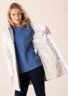 Женское весенне-осеннее пальто Gil Bret имеет широкий прямой крой, с металлическим блеском на примятой ткани верха. Оно открывается спереди на молнии, защищенной клапаном с кнопками. Практичный капюшон с клетчатой подкладкой снимается при желании и обеспечивает укрытие от неожиданного дождя и неприятного сильного ветра. Передние карманы открыты, а клетчатую подкладку на внутренней стороне рукавов при желании можно вывернуть наружу, чтобы открыть внутреннюю часть, что добавляет акцент к светлому основному цвету. Задняя часть имеет оригинальный дизайн, с застегивающимся по центру замком, обеспечивающим дополнительную ширину и легкость движения при открывании. Внутренняя отделка выполнена из шелковистого полиэстера и имеет нагрудный карман с пуговицей. Рост модели -178 см, носит размер 36. Длина составляет 82,5 см.