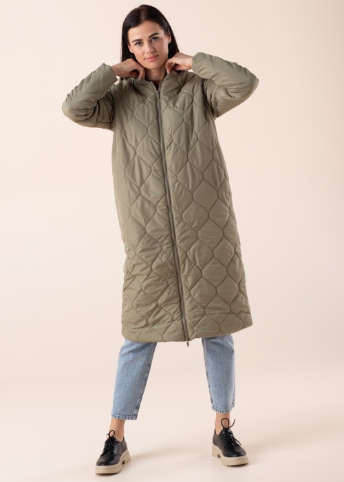 Весенне-осеннее пальто Sophia от Noisy May модное и практичное. Стёганое пальто «песочные часы» имеет широкий прямой крой с вырезом «бомбер» в рубчик и двусторонним замком спереди. По бокам расположены открытые карманы, концы рукавов свободно ниспадают. Внутренняя часть выполнена из гладкого шелковистого переработанного полиэстера. Рост модели 176 см, изделие в размере S. Длина по спинке 110 см.