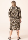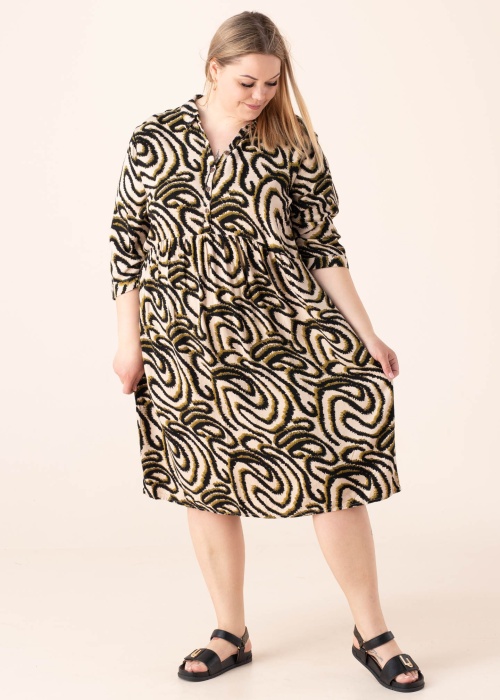 Платье с оригинальным узором Ciso выглядит невероятно стильно и эффектно. Полудлинные рукава. Классический отложной ворот дополнен V-образным вырезом с застёжкой на пуговицы. Красиво ниспадающий подол платья обеспечивает комфорт. Рост модели 167 см. Демонстрируемое изделие размер 46. Длина изделия по спинке для данного размера 105,5 см. Состав материала: вискоза 100%. Цвет: бежевый/узорчатый