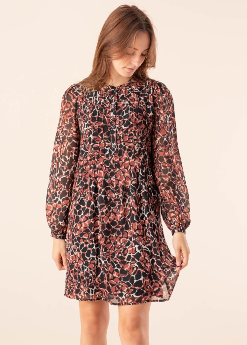 Простое платье Esprit подходит идеально для повседневного ношения. Красивое интересный узор платье - просторный дизайн свободно обвисающее и летящее. На горловине находится застёжка на пуговицы , на концах рукавов- пуговица , также внутри подюбник. Рост модели - 170 см и носит размер 36.
