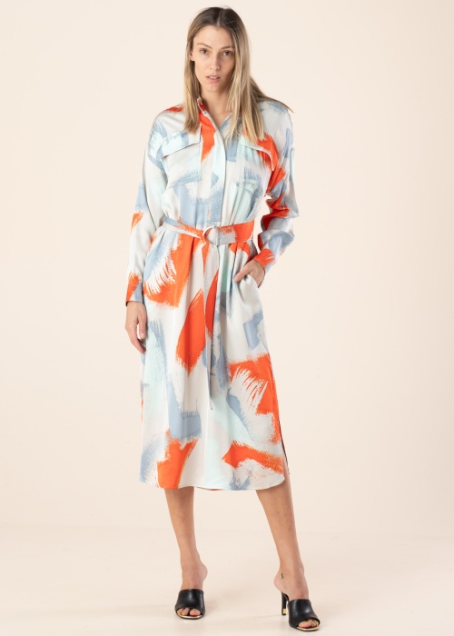 Многоцветное и со вкусом платье Esprit представляет классику. Шелковистое и хорошо обвисающее платье- воротник с отворотом и длина Midi. На горловине имеет застёжка на пуговицы , практичности добавляют карман и на внешнем боку разрез. Рост модели - 177 см и носит размер S.