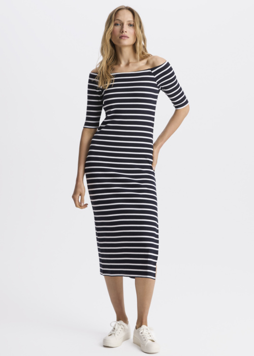 Платье Diverse для женщин, модель Feyela, представляет собой стильный и удобный выбор. Оно выполнено в полоску и изготовлено из эластичного материала, что делает его идеальным для повседневной носки в летнее время. Открытый крой на плечах и разрез слева придают платью изысканность и женственность.