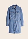 Женское платье от Levi's выполнено в винтажном стиле и выглядит очень элегантно. Оно имеет воротник с отделкой и застегивается на пуговицы. Платье сделано из плотного денима. На груди расположены карманы с пуговицами, а по бокам — открытые карманы.