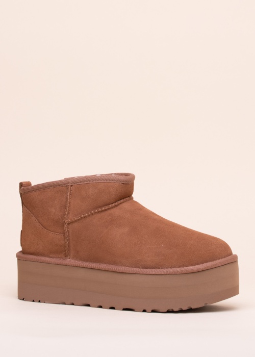 Стильные и модные женские полусапожки UGG Classic Ultra Mini Platform идеально подходят для зимы, обеспечивая тепло и комфорт. Дизайн обуви включает декоративный шов сбоку, который придает уникальный вид. На пятке расположена фирменная метка бренда, подчеркивающая высокое качество и оригинальность продукта.