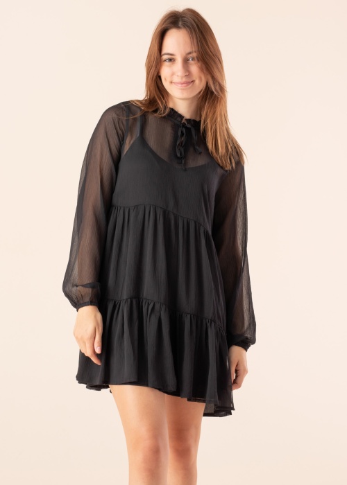 Женственное платье Noisy May отличается многогранностью. На горловине имеет завязываемый шнурок , удобства добавляют резинка на концах рукавов , также юбочную часть составляют расширающиеся воланы. Внутри подюбник. Рост модели - 170 см и носит размер S.