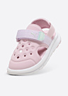 Сандалии для девочек Puma Evolve - отличный выбор для активных детей. Эти сандалии легкие и удобные, что делает их идеальными для длительного ношения. Закрытый носок и спортивный дизайн обеспечивают дополнительную защиту и стиль. Они подходят как для использования в помещении, так и на улице, благодаря перфорации в области носка, которая обеспечивает вентиляцию. Сандалии оснащены застежкой на липучке сверху и резинкой сзади, а также имеют фирменную надпись Puma сзади.