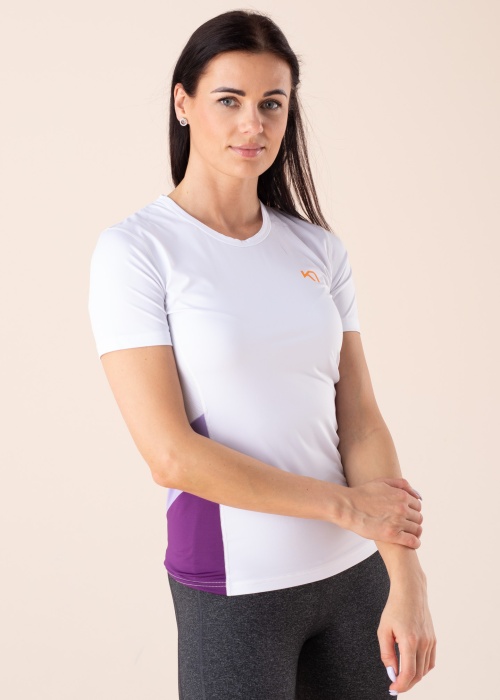 Функциональная рубашка для тренировок Kari Traa Janni подходит для занятий спортом как внутри помещения, так и на открытом воздухе. Светлой рубашке придают экспрессивности на спинной части помещённые лилового цвета вставки с пробегающими через них по всей длине изделия резинками с названием бренда неонового оранжевого цвета, гармонирующие с логотипом бренда на нагрудной части слева. В подмышечной части имеющиеся вставки из сетчатой ткани дают возможность телу дышать. Мягкая и эластичная ткань обеспечивает полную свободу движений, для получения наилучших спортивных результатов. Рост модели 176 см, носит размер S. Материал: полиэстер 86%, эластан 14%. Цвет: белый/лиловый.