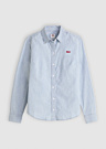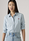 Женская рубашка от Levi's — это классическая модель с воротником и полосатым узором. Она изготовлена из прочной ткани и застегивается на пуговицы спереди. На груди находится фирменный логотип бренда.