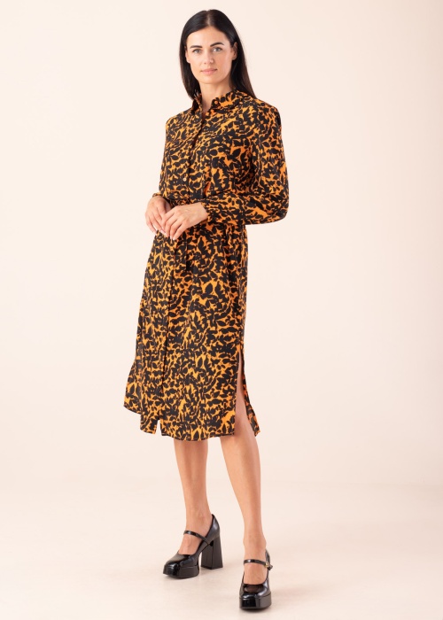 Своеобразное рубашка-платье JDY подходит для дней разного характера. Классное воротник с отворотом рубашка-платье - интересный узор хорошо обвисающее и подвижное. Спереди имеет застёжка на пуговицы , в середине пояс на завязках , также на концах рукавов резинка. Рост модели - 176 см и носит размер S.