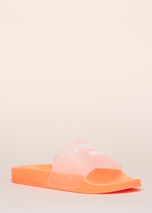 Замечательные детские шлёпанцы для мальчиков Amos от Guess отлично подходят для теплого времени года. Над стопой изгибается прозрачная резиновая пряжка, которая дополнительно украшена рельефным названием бренда. Прорезиненность внутренней поверхности способствует устойчивости стопы, стелька, учитывающая форму стопы владельца обеспечивает отличную поддержку. Более толстая неоновая подошва обеспечивает отличное сцепление как с сухой, так и с мокрой поверхностями. Вес размера 34 - 101 г.