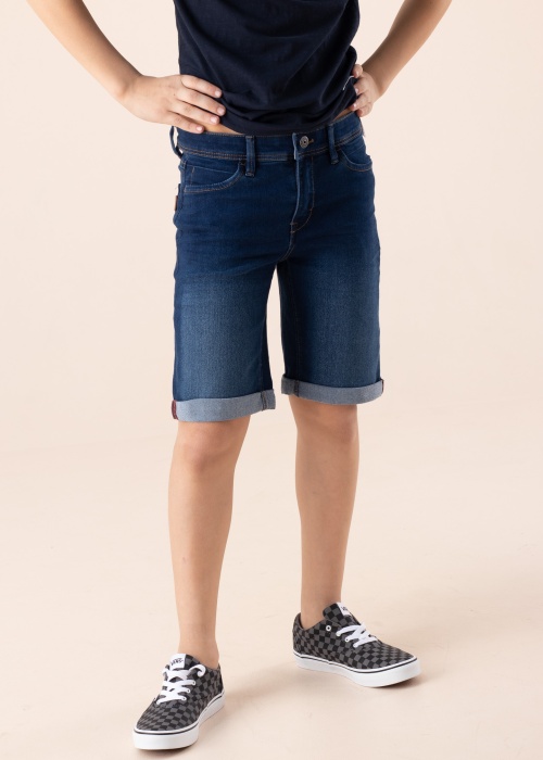 Шорты Sofus от Name It стильной длины до колена с подвернутыми краями. Пояс застегивается на крючок и молнию спереди и регулируется с помощью резинки и пуговицы на внутренней стороне. Спереди и сзади есть открытые карманы. Эластичность материала повышает комфорт при ношении. Рост модели 146 см, изделие в размере 152.