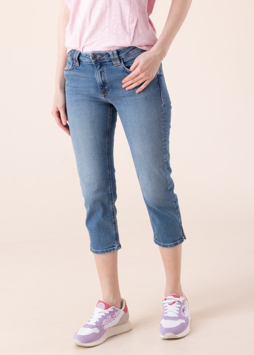 Летние бриджи от Esprit идеально подходят для повседневного ношения! Талия средней посадки прямого кроя изделия застегивается на молнию и пуговицу. Спереди есть три кармана, один из которых поменьше, и два открытых кармана сзади с потертыми элементами. Мягкая и эластичная ткань изделия приятно облегает фигуру, разрезы по нижнему краю добавляют женственности. Рост модели 174 см, изделие в размере 27-22.