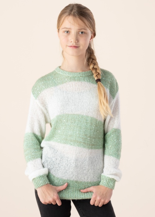 Полосатый узор свитер Guess подходит для повседневного ношения. Свитер- блестящий и круглая горловина. как на краях рукавов, так и снизу- соник и на внешних поверхностях блестящие пайетки. Будь готовым к каждому классному дню. Рост модели - 153 см и носит размер 147.