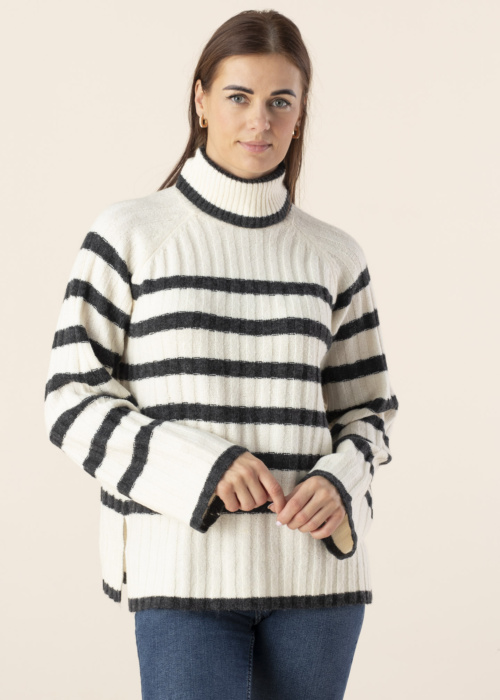 Женский свитер JDY Miley имеет высокий воротник, который делает его стильным и уютным. Он украшен полосками, что добавляет ему оригинальности и динамичности. Благодаря рукавам реглан и мягкой вязке, свитер обеспечивает комфорт и свободу движений. Свободный крой делает его отличным выбором для повседневной носки. Модель ростом 176 см носит размер S.