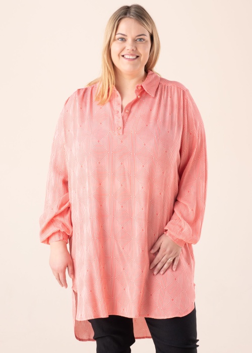 Повседневная туника Fransa Plus Size подходит для дней разного характера. Просторный дизайн туника- воротник с отворотом и с удлинённым покроем сзади. Спереди застёжка на пуговицы и на концах рукавов резинка. Игривый узор добавляет привлекательности. Рост модели - 167 см и носит размер 46.