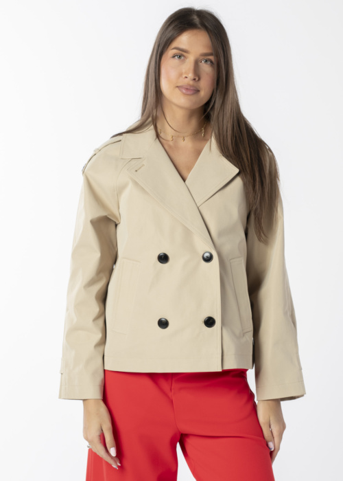 Женская весенне-осенняя куртка от Tom Tailor отличается лаконичным стилем и свободным кроем. Она застегивается на пуговицы и имеет воротник с лацканами. Спереди расположены открытые карманы. На концах рукавов также есть пуговицы, а декоративный элемент находится на плече. Модель имеет рост 178 см и носит размер S.
