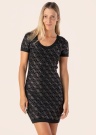 Женское платье Guess Paige 4G выполнено из приятного на ощупь материала, который обеспечивает комфорт и уют. Круглый вырез и короткие рукава придают платью женственность и элегантность. Передняя часть украшена сверкающими камешками, добавляющими блеска и изысканности. Резинки на манжетах и по нижнему краю обеспечивают идеальную посадку и завершенность образа. Модель имеет длину 177 см и носит размер S.